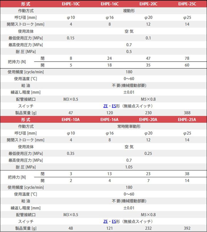 簡介: 長壽命 / 高夾持力 / 可在3個方向安裝 / 高夾持精度 / 採用埋入式開關 / 可選配安裝適配器 / A:常開 C:雙作動